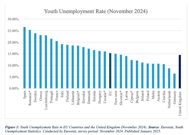 The figure below illustrates the seasonally adjusted youth unemployment rates across EU member states and the United Kingdom as of November 2024 (Eurostat, January 2025). Youth unemployment, defined as the share of the labour force aged 15 to 24 unable to find work, remains a significant concern across the region. Rates vary widely: Spain (26.6%) and Romania (25.3%) face the highest levels, reflecting persistent structural weaknesses, while Germany (6.4%) and the Netherlands (8.7%) report the lowest, underscoring the success of more robust training and employment systems.