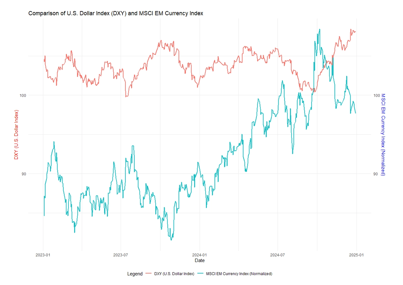 Through 2024, emerging markets (EMs) navigated the dual challenges of a strengthening U.S. dollar and rising U.S. Treasury yields, which exerted considerable pressure on their economies. The U.S. Federal Reserve's decision to raise interest rates in March and May of 2022, as part of its ongoing strategy to combat inflation, has had far-reaching implications for global financial markets (Trading Economics, 2024). These rate hikes, have bolstered the value of the U.S. dollar, triggering ripple effects across global markets, particularly in EMs. As the dollar appreciates, many EMs—burdened with significant foreign-denominated debt—are confronting higher borrowing costs and increased vulnerability to capital outflows. The figure below highlights the inverse relationship between the U.S. dollar’s strength and the performance of emerging market currencies. As the DXY index rises, emerging market currencies typically weaken, underscoring the mounting challenges these economies face in light of both rising U.S. Treasury yields and a stronger dollar.