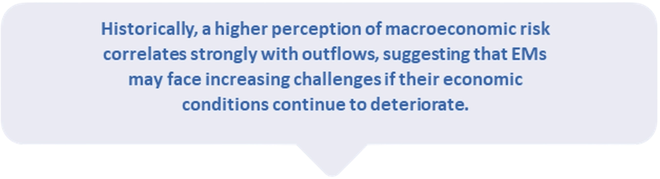 Additionally, several global factors are complicating the outlook for emerging markets. High oil prices, a slow recovery in China, and geopolitical instability in the Middle East have further strained these economies. While the Bloomberg Emerging Markets Capital Flow Proxy Index—tracking capital flows into and out of EMs—has not yet raised major concerns, the Citi Emerging Markets Macro Risk Index has shown an increase in investor perceptions of risk, which could further amplify capital outflows (Bloomberg, 2024). Historically, a higher perception of macroeconomic risk correlates strongly with outflows, suggesting that EMs may face increasing challenges if their economic conditions continue to deteriorate.