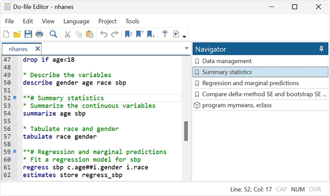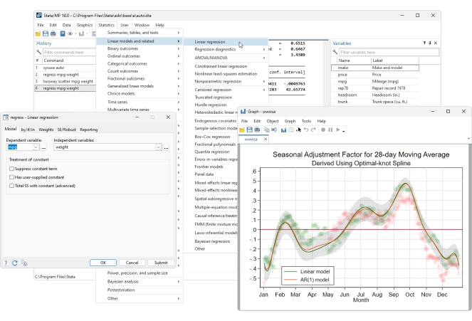 Se puede acceder a todas las funciones de Stata a través de menús, diálogos, paneles de control, un editor de datos, un administrador de variables, un editor de gráficos e incluso un generador de diagramas SEM. Puede navegar por cualquier análisis con solo apuntar y hacer clic.