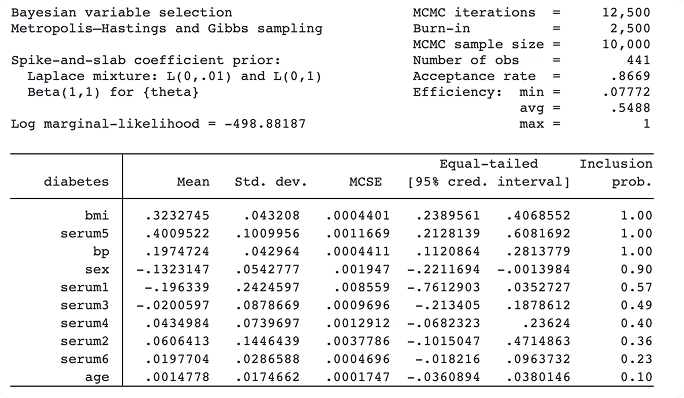 Realice análisis econométricos bayesianos utilizando uno de los métodos de Monte Carlo con cadenas de Markov (MCMC). Puede elegir entre varios modelos compatibles, como modelos de datos de panel, jerárquicos, VAR y DSGE, o incluso programar el suyo propio. Hay disponibles amplias herramientas para verificar la convergencia, incluidas múltiples cadenas. Calcule estimaciones de la media posterior e intervalos creíbles para los parámetros del modelo y funciones de los parámetros del modelo. Puede realizar pruebas de hipótesis basadas en intervalos o en modelos. Compare modelos usando factores de Bayes. Calcule el ajuste del modelo usando valores predictivos posteriores. Genere predicciones y pronósticos. Si desea tener en cuenta la incertidumbre del modelo en su modelo de regresión, utilice el promedio de modelos bayesianos.