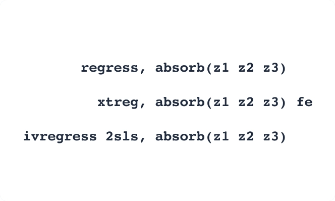 Absorba no solo una sino múltiples variables categóricas de alta dimensión en sus modelos lineales y lineales de efectos fijos con la opción absorb() de los comandos areg y xtreg.