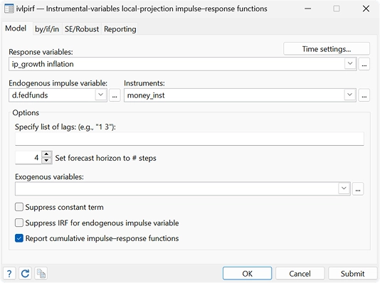 Construya modelos multiecuación y genere pronósticos de niveles, tendencias, tasas, etc. Ya sea que tenga un modelo pequeño con unas pocas ecuaciones o un modelo completo de la economía con miles de ecuaciones, Stata puede ayudarle a construir ese modelo y producir pronósticos. Su modelo puede incluir tanto relaciones estimadas como identidades conocidas. Puede crear y comparar fácilmente pronósticos bajo diferentes escenarios, crear pronósticos estáticos y dinámicos e incluso estimar intervalos de confianza estocásticos. Puede crear su modelo utilizando una sintaxis de comandos intuitiva o mediante el panel de control interactivo de pronósticos.