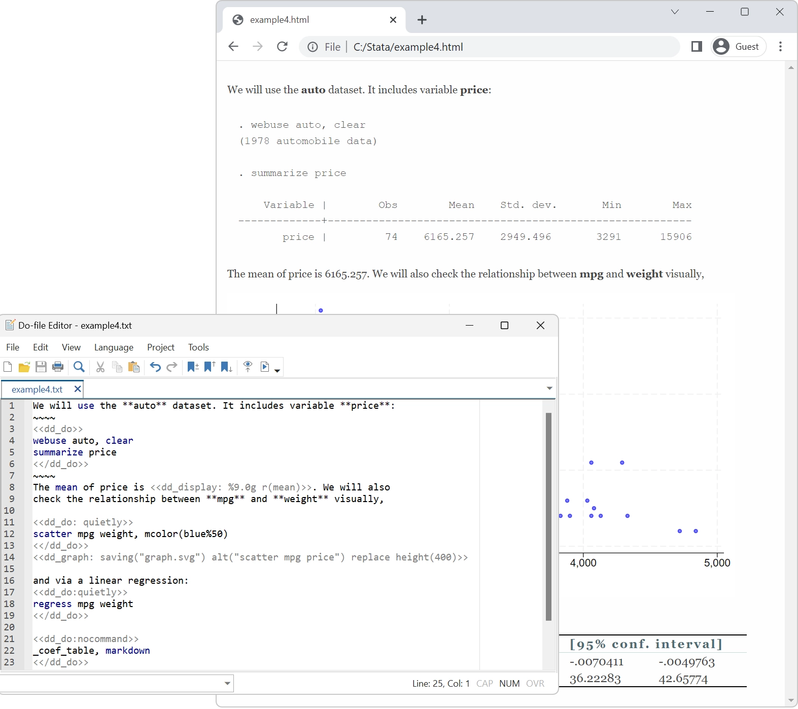 Stata está diseñado para investigación reproducible, incluyendo la capacidad de crear documentos dinámicos que incorporen los resultados de su análisis. Cree archivos de Word o PDF, llene hojas de cálculo de Excel con resultados y deles formato a su gusto, y combine Markdown, HTML, resultados de Stata y gráficos de Stata, todo desde dentro de Stata. Cree tablas que comparen resultados de regresión o estadísticas resumidas, use estilos predeterminados o aplique los suyos propios, y exporte sus tablas a Word, PDF, HTML, LaTeX, Excel o Markdown e inclúyalas en sus informes.